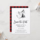 Rustik vildmark bergsklädd spara datum - Vår rustika vildmarks bergsklädda mall för att spara datumet har en för hand illustrerad storslagen bergs- och städsegrön miljö med handskrivna stiltypsnitt. Baksidan av inbjudan är trendig, röd och svart buffelplaid. Visas på rustikt kraftpapper, men du kan välja vilken papperskvalitet du föredrar.
