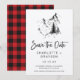 Rustik vildmarksbergsplott Save the Date - Vår rustika vildmarksbergsplott save the date-mall har en handillustrerad majestätisk bergs- och städsegrön träddesign med handgjord, typsnittsstiliserad text. Baksidan av inbjudan har en trendig, röd och svart buffplott. Visas på rustikt kraftpapper, men du kan välja vilket papper du föredrar.