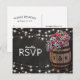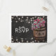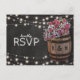 Stilrena landliga bröllopssvarskort med en rustik svart tavla bakgrund, sträng blinkande ljus, rosa rosor och gipsfulla blommor, en vingård trätunna med era initialer och en bit knuten snur.