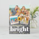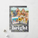 Skapa din egen personliga familjefotocollage med rustika julkort denna höst- och vintersäsong. Tycker du om solrosor och röda järnekbär? Dina vänner och familj kommer att älska att se era leende ansikten på en sådan ljus och glad floral mall. Den unika akvarelldesignen har en vintagegrå träkonstruktion upplyst med eleganta glödande ljusslingor på framsidan, medan baksidan visar en lysande flätad hjort med horn och en rutig slinga, tillsammans med baby Rudolf den rödnosade renen. Under deras hovar ligger fler festliga julbelysningar över ett lager vitt snö och gula solrosblad. Byt enkelt ut de fyra bilderna mot dina egna familjefoton (3 på framsidan, 1 på baksidan), och gör andra enkla ändringar, som typsnittsstil och bakgrundsfärger. Meddelandet "merry and bright" kan ändras till något annat, och glöm inte att lägga till din familjs namn och årtal längst ner. Du kan också lägga till din egen julhälsning på baksidan. Vill du byta bakgrundsfärger? Välj bland olika trätoner (dessa lager kan visas om du anpassar designen ytterligare). God jul och gott nytt år, och ha kul när du skapar dina egna personliga boho-solros-julkort! Kategori: botaniska träd-julkort; 4-fotocollage-julkort; och vintage-julkort