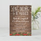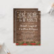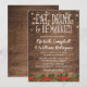 Rustika julbröllopsinbjudningar med en varm träbakgrund, gnistrande slingljus, en julgranskrans blommiga trim, orden "ÄT, DRICK OCH BLI GIFT" och en personlig bröllopsmall.