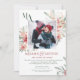 Fira din kommande vinterbröllop med detta charmiga "Spara datum"-kort med ett mysigt parfoto som ramas in av en vacker, handmålad akvarellblommig krans i mjuka vinterfärger i rosa, rött och grönt. Perfekt för julbröllop, denna design ger värme och elegans till din speciella dag, medan de botaniska accentuerna skapar en rustik och festlig stämning. Idealisk för dem som planerar ett vinter-, högtids- eller lanthustrubröllop med en touch av modern stil. Anpassa detaljerna för att göra det unikt för dig!
