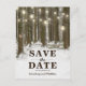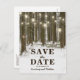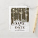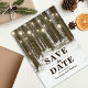 Lantlig julvårld - Spara datum-kort med en romantisk vintermiljö från en snöig skog, strängar med blinkande ljus, ett hjärta skapat i stammen på ett träd, era initialer och en modern rädda-datum-mall för bröllop.