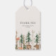 Skogstemat present- och förmånsetikett för barnsbad med rustik vinter skog och djur design med personligt namn och datum.