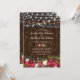 Vintertema bröllopsinbjudningar med en rustik träfattsbakgrund, lampor, festliga julpoängflor och en modern bröllopsmall.