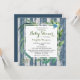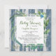 Den här moderna och trendig babyvisaren har en snyggt vattenfärg ram i gröntens blad på en strålande, blå träbakgrund som omger din personlig. Avstånd länge Virtuella inbjudningsinformation för babyskor. Redigera bara texten i textrutorna.