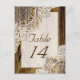 Elegant rustik vit spets på trädgifts tabellnummer vykort med vit spets på brunt trä som täcker två hörn av en vit rektangel med ram av brunt trä. Texten är i brunt. Notera att spets och trä alla är "tryckta på" och inte riktiga material. Denna eleganta, shabby chic sofistikerade och romantiska design med en rustik essens är en del av en bröllopssats och är perfekt för ett country chic eller västerländskt bröllop under våren, sommaren eller hösten. Det kommer också att fungera perfekt för ett bröllop med ett västerländskt lada tema.