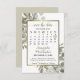 De här vackra datumkorten kommer att ge dina vänner och din familj information om ditt kommande bröllop. De har en strålande grönt och guld-design med en kalender för din bröllop-månad och ett hjärta runt din speciella dag. Det finns handmålade vattenfärgsspikar av eukalyptus löv och gräs grenar. Titeln är skriven i lacy script calligraphy med plats för parets namn, datum, plats och webbplats i bröllop.