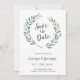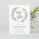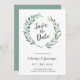 Rustic sparar datumet med ord, "Spara datumet" i ett handskriftsteckensnitt inuti en vattenfärg som målats i en grön krans, över en vit bakgrund. Baksidan är en matchande grönt och kan ändras till valfritt färg. Denna enkla botaniska utformning är underbar för en sommar firande.