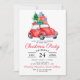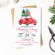 Vinterinbjudningar till Rustic christmas-temapartyet med en enkel vit bakgrund, vintage röd lastbil med julklappar, julafton träd och traditionell party-mall som är lätt att anpassa.