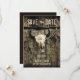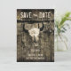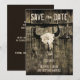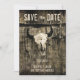 Rustic bröllop westernt tjallande skalle med horn vintage spara datum meddelande platta kort. Ranch grunge lada wood struktur. Cowboyinspirerad design. Antikabrunt sepia bison bra art. Upphovsrätt Marg Seregelyi Fotography.