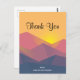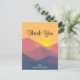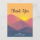 Tack-kort med en grafisk illustration med många bergstoppar med starkt gult solljus som går ner bakom bergen. Skapad med geometriska polygonala former. Enkel minimalistisk design. Färgerna sträcker sig från mörkblått till ökenrött.