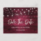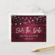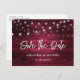 Rustik rödbrun bröllops kortsvar med rustika trädetaljer dekorerad med lampor.