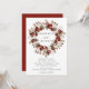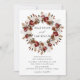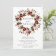 Eleganta blommiga bröllopsinbjudningar med era namn omgivna av en krans av akvarellrosor, grönska och lövverk i nyanser av burgunderrött, elfenben, grönt, brunt och guld med era bröllopsdetaljer visade nedanför. Baksidan av den höstblommiga kransbröllopsinbjudan har en mörk rostig röd/burgunderröd bakgrund.