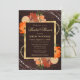 Den här lantliga bröllopsduschinbjudan har rika brända orangea, persikofärgade och krämfärgade höstblommor arrangerade över en varm träbakgrund för en mysig, höstinspirerad look. Mjuk grönska och ömtåliga accenter tillför naturligt charm, medan den guldborderade textpanelen och den eleganta typografin ger en förfinad, festlig känsla. Med sin varma palett, naturliga texturer och romantiska botaniska detaljer sätter denna design den perfekta tonen för en hjärtlig bröllopsdusch fylld med kärlek, glädje och säsongens skönhet.