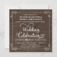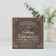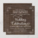 Rustika inbjudningskort för bröllop i trä -- Virvlande, lockiga rullar och ram i rustik stil på en bakgrund av knuten trä (bild). Lägg till namnen och information om bröllopet i denna lättanvända mall. Vintage-inspirerad typsnitt med lassostil kalligrafi i västerländsk stil - ändra textstilarna för att återspegla ditt formella eller semi-formella retrobröllopstema. Fyrkantiga inbjudningskort är perfekta för moderna trendar med en rolig touch av gammaldags sydstats charm för den traditionella bruden och brudgummen. Prisvärt för brudar på en budget. Finns även i kritskriftstil. OBS: Denna design är endast avsedd för fyrkantiga kort, vilket kräver extra porto.
