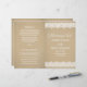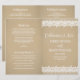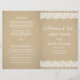 Bröllopsprogram med texten "Kärlekens Firande" i typsnitt, en charmig illustrerad kantdesign med vintage vita blommor och prickig spets, och en bakgrund med ett rustikt kraftbrunt papperstextur. Anpassa den anpassade texten för ditt brölloppssällskap, ceremonidetaljer och tackmeddelande. Notera: dessa program i textviktpapper levereras platta och kräver vikning för montering.