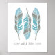 En trio av stiliserade fjädrar i jordnära nyanser av blå, turkos, grå och brun, personlig med valfri text.