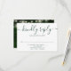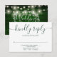 Ett rustikt RSVP-kort med dina detaljer i chic typografi och personifierat med dina namn och handritad blomsterlövverk och trädgårdsbelysningar på en rustik grön träpaneler bakgrund på baksidan. Designad av Thisisnotme©