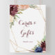 Den här rustika skylten med blad i guld och blommor är perfekt för ett modernt bröllop eller brudfest. Designen har handritade vattenfärgblommor i lila, marinblå, rosafärgad, vinröd, samt gröna blad och bladguld som pryder en elegant geometrisk ram.