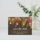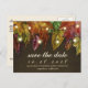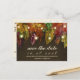 Rustika höstblad Spara datum-kort - har en brun, sliten vintagebakgrund med höstblad och strängljus med dekorativa texter. Se den matchande designkollektionen på denna sida.