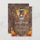 Rustika bröllopsmottagningskort med lantlig trädriftsbakgrund, höstlöv, en tänd lykta, stränga glimmljus och en modern bröllopsmall.