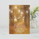 Bröllopsinbjudan med hösttema från skogen med en rustik höstskogsstämning med träd täckta av röda, orange och gula blad, ett skuret hjärta med era initialer, gnistrande slingljus i murarljusglas och en modern textmall för bröllop.