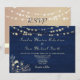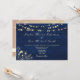 Fira din kärlek med denna eleganta rustika bröllopsinbjudan med en marinblå trähydd bakgrund, lysande ljusslingor och utsökta gyllene blomsterdetaljer. En perfekt kombination av charm och romantik för vinter-, lada- eller kvällsbröllop. Matchande RSVP-kort ingår.