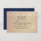 Elegant och rustik, detta bröllopssvarskort har varma lysande stränglyktor över en mjuk beige bakgrund med utsökta gyllene blomsterdekorationer. Samordnat med den marinblå och stränglyktor bröllopsserien, innehåller det matpreferenser och en klassisk svarslayout för enkel gästrespons. En charmig detalj för vinterbröllop, ladufester eller kvällsmottagningar.