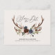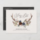 Rustika kronhjort skript marin burgunder blommig bröllop spara datum postkort. Del av en modern samling.