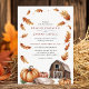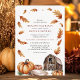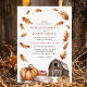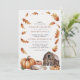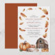 Fira din höstbröllop med denna charmiga rustika inbjudan som visar en mysig lada, pumpor och en kaskad av höstlöv på en ren, off-white bakgrund. De varma, jordnära färgerna och enkla, naturliga elementen skapar en lugn och inbjudande atmosfär, perfekt för en landsbygdsfirande. Denna design fångar essensen av höstens skönhet, vilket gör den till ett idealiskt val för par som söker ett elegant och rustikt tema för sin speciella dag.