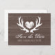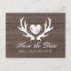 Bruna ladan trä landsbygd chic hjorthorn bröllop spara datum kort. Del av rustic hunter / jakt tema set. elegant design med vintage urblekt hjärta. perfekt för sommaren utomhus trädgård bröllop i juli och augusti. Anpassa med namn på brud och brudgum plus datum för giftermål. Anpassningsbar bakgrundsfärg. Stilig distressed script typografi. Vacker vektor konst för trendiga bröllop.
