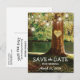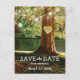 Vårträd spara datum vykort med en romantisk skog och strandpromenad med ett rött bärträd, snidad kärlekshjärta med era initialer, sträng twinkellyktor och en modern mall för att spara datum.