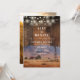 Denna rustika västernlada träbröllopsinbjudan med en västernranch bergsscen och strängljus på en lada träbakgrund kan anpassas med din information i stilfull typografi och speciellt foto på baksidan. Designad av Thisisnotme