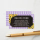 Rustika böcker för bebis inbjudningskort för en baby-q-dusch med gula solrosor, tryckt trästruktur och ett lila gingham-mönster.