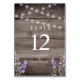Rustik och elegant med falskt mörkbrunt trä med strängljus längs överkanten och lila blommor på undersidan bröllopsbord nummerskylt.