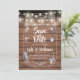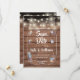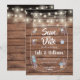 Strängljus ovanför en konstnärlig murad glasburk fylld med dina personliga detaljer för save the date och utspridda ömtåliga blommor på en rustik träpanel bakgrund. Designad av Thisisnotme©