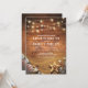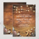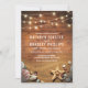 Bröllopsinbjudningar för stranddestination med rustik trädriftsbakgrund, gnistrande slingljus, sandstrand med en sjöstjärna och snigelskal.