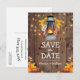 Rustika landsbygd höst sparar datum-kort med en trädriva lada som bakgrund, höstlöv, en tänd lykta, sträng glödande ljus och en modern bröllsmall.