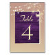 Detta eleganta och moderna nummerkort för bröllopsbord har en rustik lila träbakgrund, vackert prydd med guldförgylld blomsterkant och ömtåliga strängljus. Perfekt för att tillföra en touch av sofistikering och charm till din bröllopsdekor.