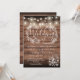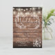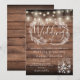 En rustik bröllopsinbjudan med vacker strängbelysning, murar och en delikat handritad rustikal blomsterkrans av botanisk bladverk med stilren handskriven typografi, på en rustik träbakgrund. Anpassa med din speciella bröllopsdagsinformation. Designad av Thisisnotme