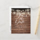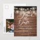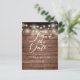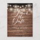 Det här rustika kortet för att spara datum har vackra ljus i tråd och ett elegant manus som sparar datumet ovanför dina detaljer som är satta i elegant typografi på en bakgrund av rustika träpaneler. Baksidan visar ditt speciella foto och har ytterligare detaljer om datumet, inklusive din bröllopswebbplats, med din returadress och utrymme för mottagarens adress. Designad av Thisisnotme