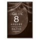 Belysa din rustika bröllopsfest med dessa charmiga bordsnummer. Den varma bruna bakgrunden visar ett vackert illustrerat träd prytt med gnistrande ljusslingor. Utkarvade initialer lägger till en personlig touch, vilket gör varje bordsnummer till en unik souvenir för din speciella dag. Perfekt för utomhus- eller inomhusfiranden skapar dessa bordsnummer en varm och inbjudande atmosfär.