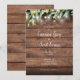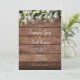 En chic bröllopsinbjudan i lantlig trädgårdsstil med vackra strängljus och naturliga färska eukalyptusblad grön lövverk, som ramar in dina bröllopsdetaljer i elegant skrivstil och klassisk typografi på en rustik trähybrid. Designad av Thisisnotme©