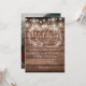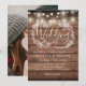 En rustik bröllopsinbjudan med vackra lampor och en delikat handritad rustik blomsterkrans av botanisk lövverk med stilren script-typografi, på en rustik trädgårdsbakgrund. Anpassa med din speciella bröllopsdagsinformation och speciellt foto på baksidan. Designad av Thisisnotme