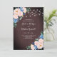 Dessa bröllopsinbjudningar har en akvarellblomma design med blå och rosa blommor, eukalyptusblad och strängljus på en trästruktur bakgrund. Anpassa inbjudan texten med din egen text. Matchande produkter finns också tillgängliga. Besök vår butik.