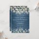 En stilren rustik bröllopsinbjudan med vackra lampor och salvia- och lila blad som faller över en blå rustik träpanelbakgrund med er bröllopsinformation i klassisk elegant text. Designad av Thisisnotme