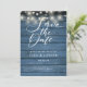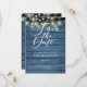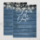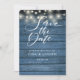 Det här rustika kortet för att spara datumet har strängljus och ett elegant manus för att spara datumet ovanför dina detaljer som är satta i elegant typografi på en bakgrund av rustika blå träpaneler. Designad av Thisisnotme©