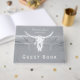 Rustik tema ljusgrå vit tjur ko skalle country western cowboy mottagning bröllop minnessaker gästbok. Vintage farmhouse inspirerad tryckt slitna textur. Gammal vilda västern antikt stil. Cool, trendig, modern gård djur design. Anpassa ditt manus. Bild copyright Marg Seregelyi Photography.
