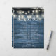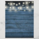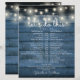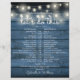 Denna rustika bröllopsschema-tidslinje med ljuskedjor kan anpassas med dina bröllopsdetaljer i snygg vit text på en bakgrund av blå träpaneler. Designad av Thisisnotme©